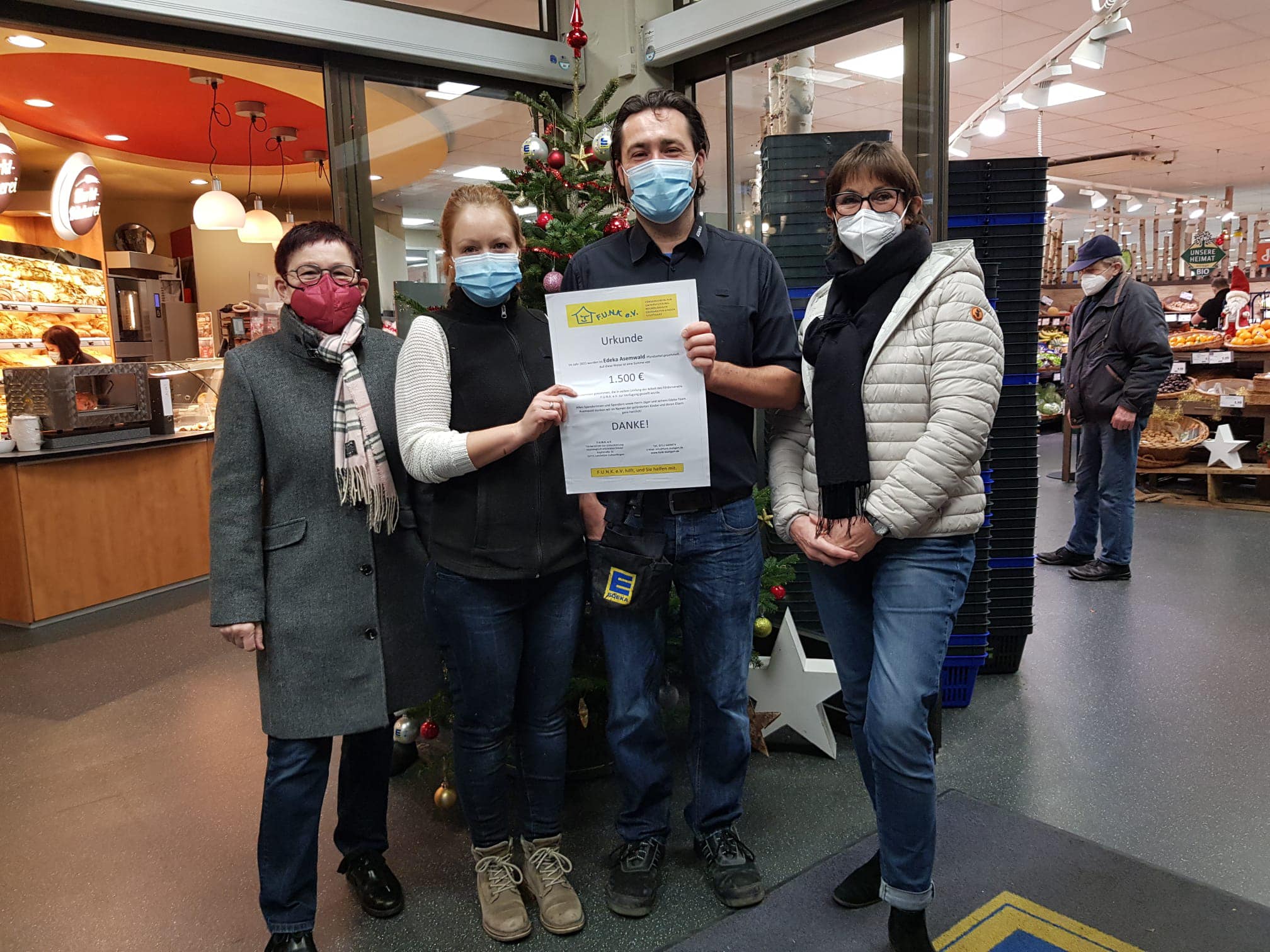 Der Erlös in der Filiale in Stuttgart-Asemwald kommt dem Förderverein F.U.N.K. e.V. (Förderverein zur Unterstützung neurologisch erkrankter Kinder Stuttgart) zu Gute. In diesem Jahr kamen € 1.500 zusammen, ein Grund für die Vorsitzende des Vereins, Margot Kuon und ihre Stellvertreterin, Elke Sattler, sich bei Florian Jäger ganz herzlich mit einer Urkunde zu bedanken.
